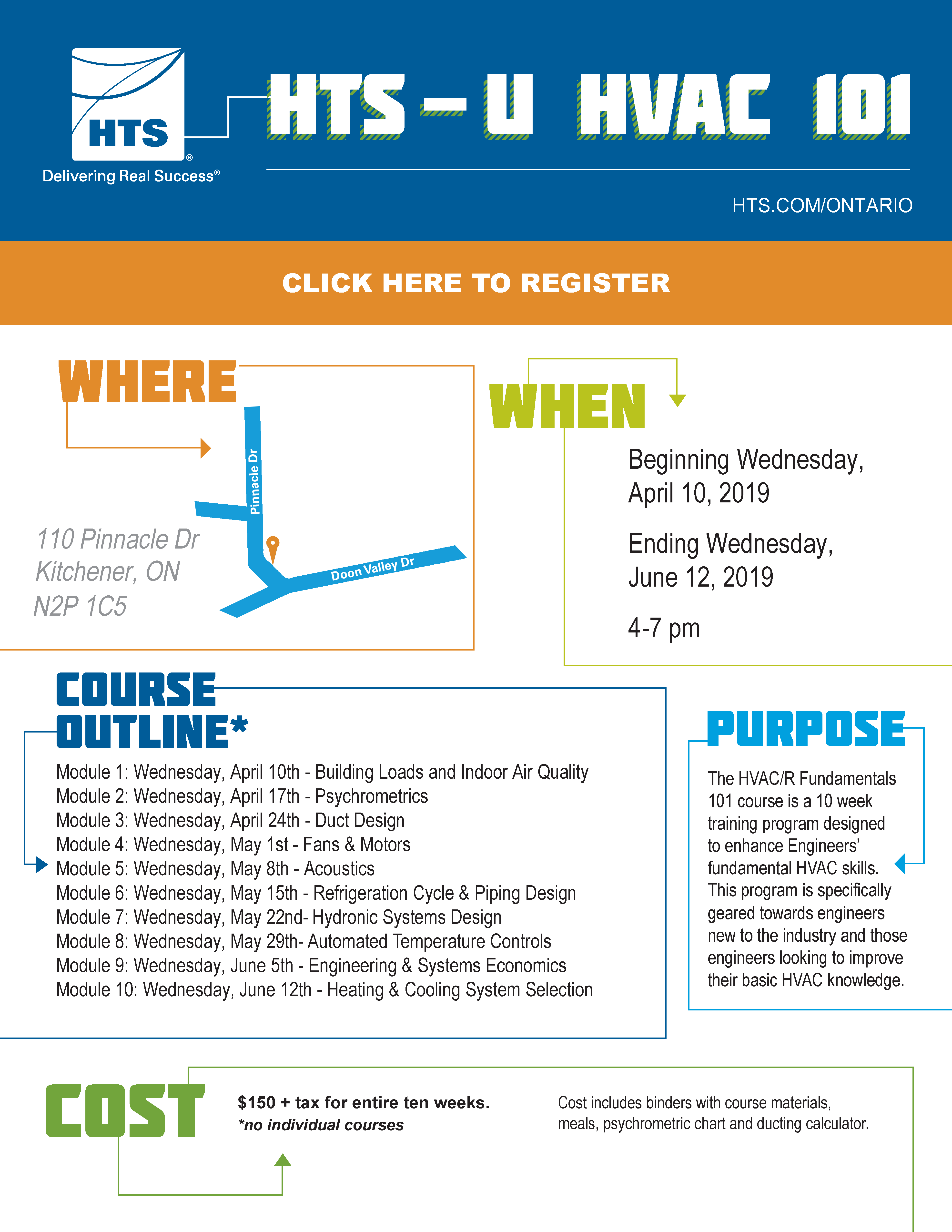 The focus of the duct design training is to teach air pressure and airflow basics, typical duct layouts, and different design principles. Hands-on learning will allow students to design a typical duct system and calculate the pressure losses.