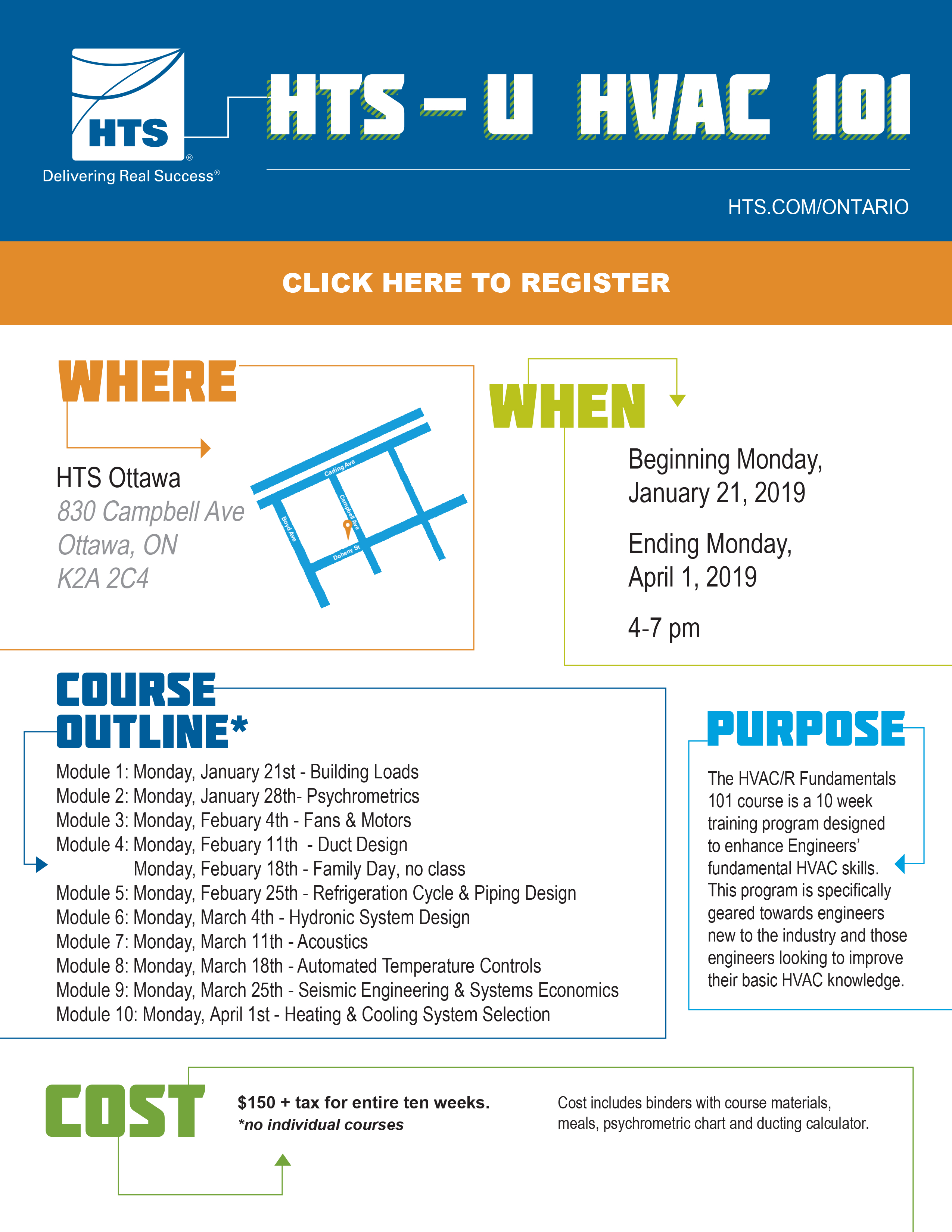 The focus of the duct design training is to teach air pressure and airflow basics, typical duct layouts, and different design principles. Hands-on learning will allow students to design a typical duct system and calculate the pressure losses.